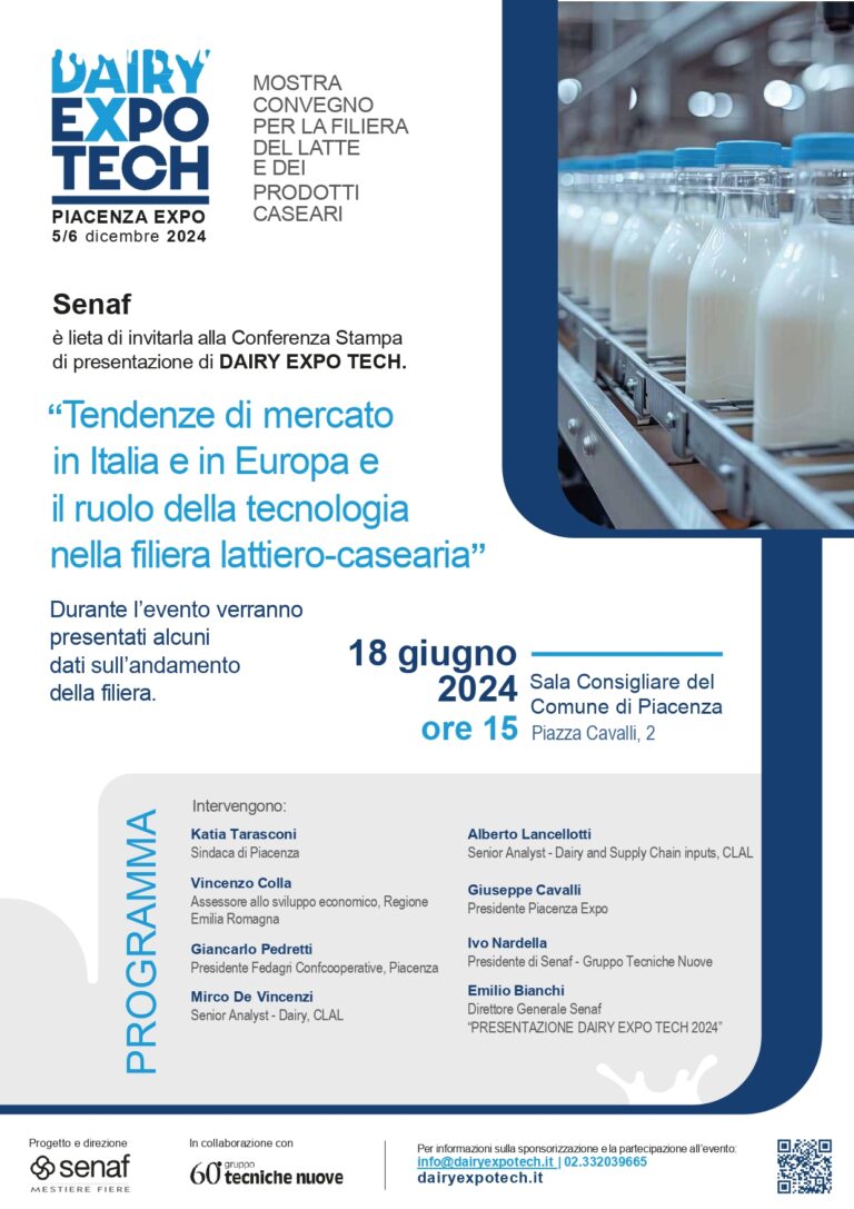 Si terrà domani alle 15 presso la Sala Consigliare del Comune di Piacenza in Piazza Cavalli, 2 la conferenza stampa di presentazione di Dairy Expo Tech, la mostra convegno che si terrà il 5-6 dicembre organizzata da Senaf in collaborazione con le maggiori riviste del settore, Il Latte, Imbottigliamento e Logistica, su macchine e le attrezzature per la produzione del latte…