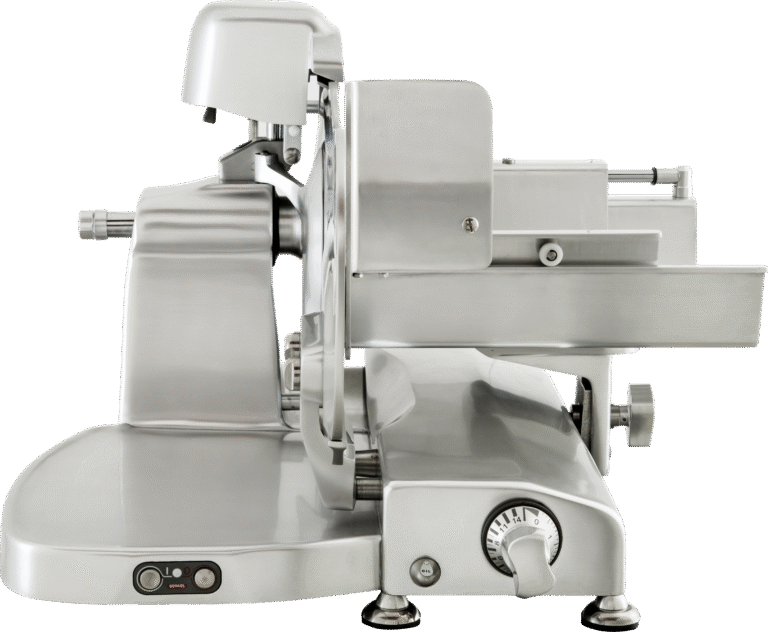 Platinum è proposta da Berkel con un doppio piatto portamerce che consente il contenimento ottimale della carne da tagliare. Completamente aperto sui fianchi e sollevabile, favorisce l’igienizzazione. Grazie al paragrasso più lungo per un appoggio ottimale, la carne fresca è accompagnata per tutta la lunghezza del taglio. Il pressamerce inox con costolature tagliate al laser…