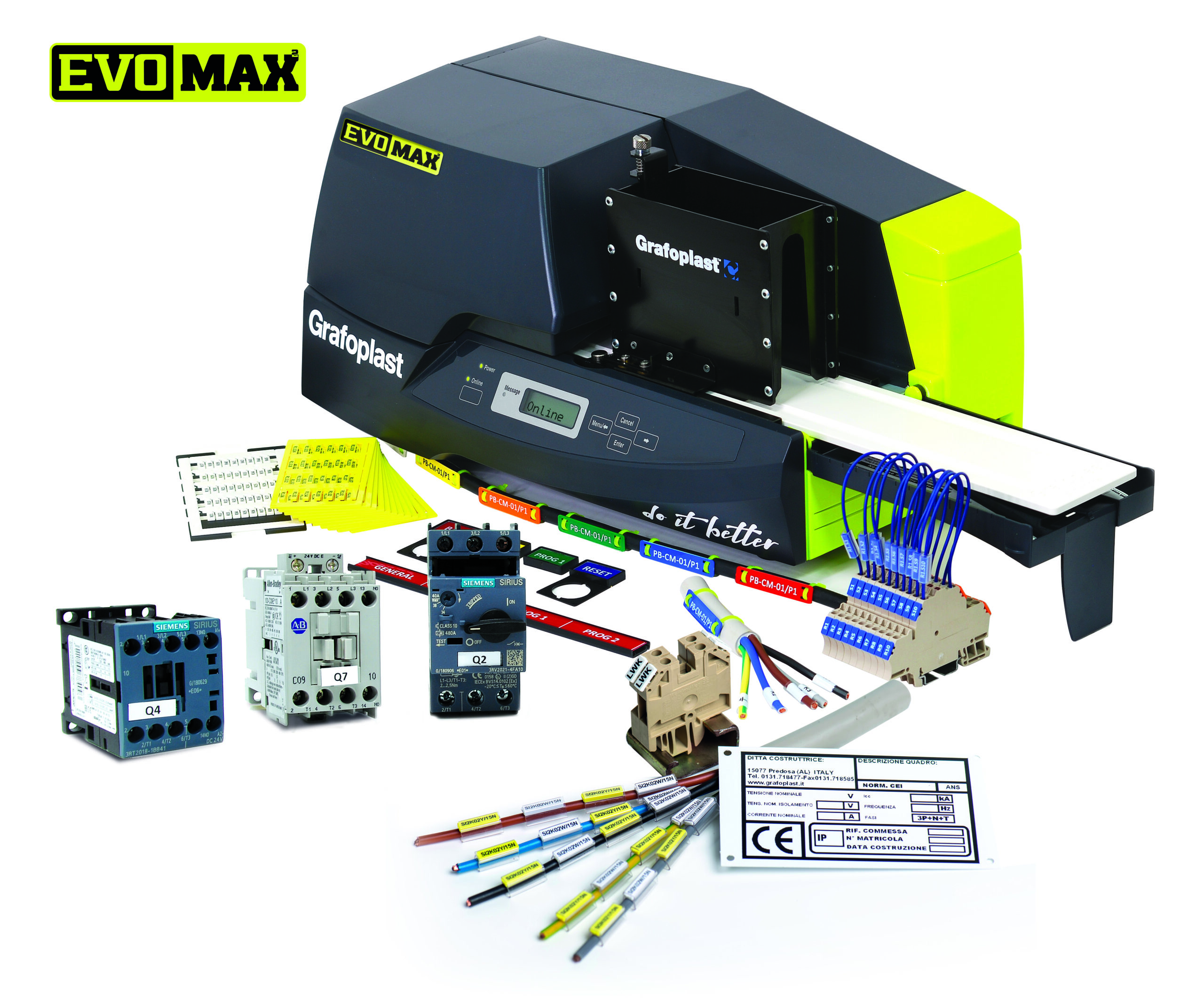 La nuova linea dedicata al settore alimentare è stampabile con il sistema a trasferimento termico EVOMAX2, l’evoluzione dei sistemi Grafoplast, che permette la stampa di etichette, targhette, strisce modulari per identificare il quadro elettrico e la componentistica.