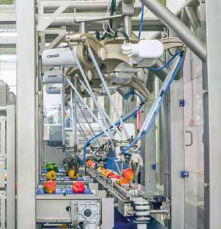 Omron fornisce i robot Delta e un sistema di visione per una linea intelligente di confezionamento di peperoni dolci.