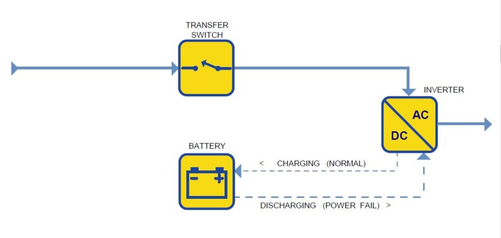 – on-line a doppia conversione – la tipologia più diffusa per potenze da 5 a 5.000 kWA – che offrono prestazioni quasi ideali della tensione in uscita ma, anche in questo caso, risultano poco efficienti e poco affidabili;