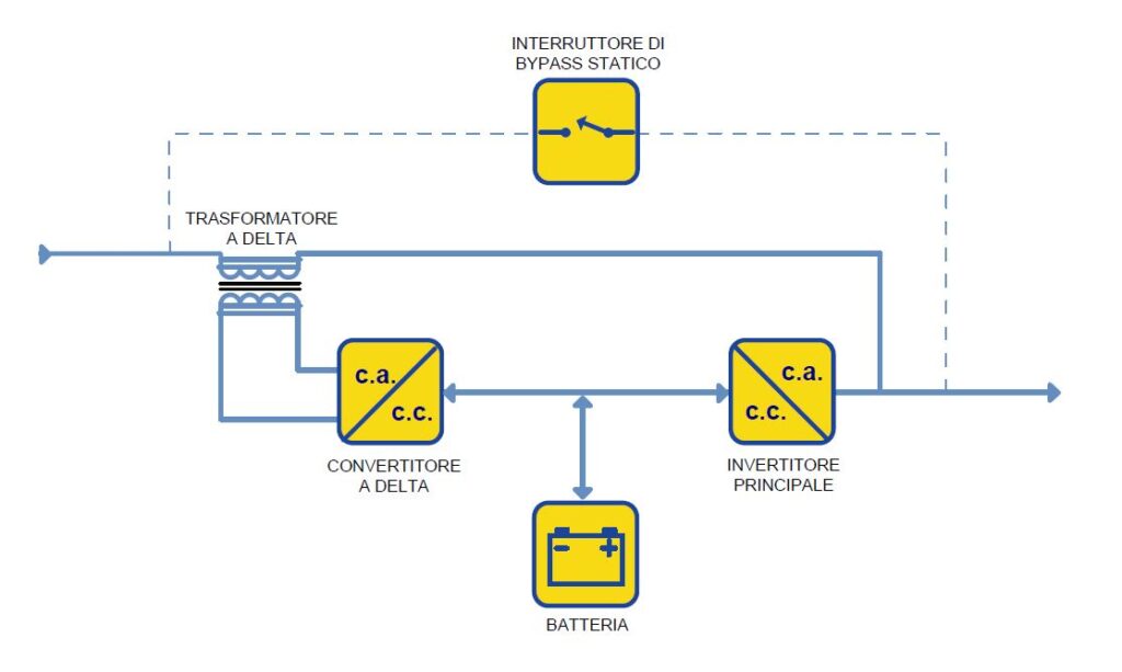 – on-line a conversione delta, equipaggiati con un trasformatore aggiuntivo e anch’essi idonei per potenze fino a 5 MW, risultano più efficienti rispetto a quelli a doppia conversione.