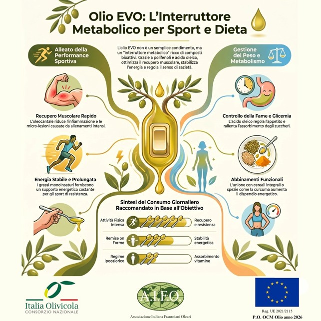 Extra virgin olive oil remains a strategic ally not only for prevention, but also for sporting activities and weight management: when used correctly, it can help improve metabolism, muscle recovery and energy management.