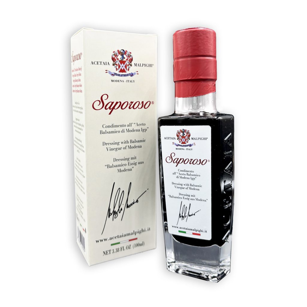 «Saporoso nasce nel 2004 con una fortissima identità – racconta Malpighi –: è stato il primo condimento scuro della Collection Malpighi, ideato a seguito di un’approfondita analisi di mercato che riscontrava la mancanza di un prodotto di fascia media posizionato, come modalità d’uso e di consumo, tra l’Aceto Balsamico di Modena Igp e l’Aceto Balsamico Tradizionale di Modena Dop. Più giovane, più agro e più fruttato rispetto a queste due grandi eccellenze del Made in Modena, Saporoso ha saputo portare nel mondo dell’Aceto Balsamico un’intuizione fresca e dinamica, aggiungendo un pizzico di creatività nella cucina di tutti i giorni: su verdure, cotte o crude, su insalate, arrosti e cacciagione, ma anche su primi piatti, come risotti mantecati, e su cocktail».