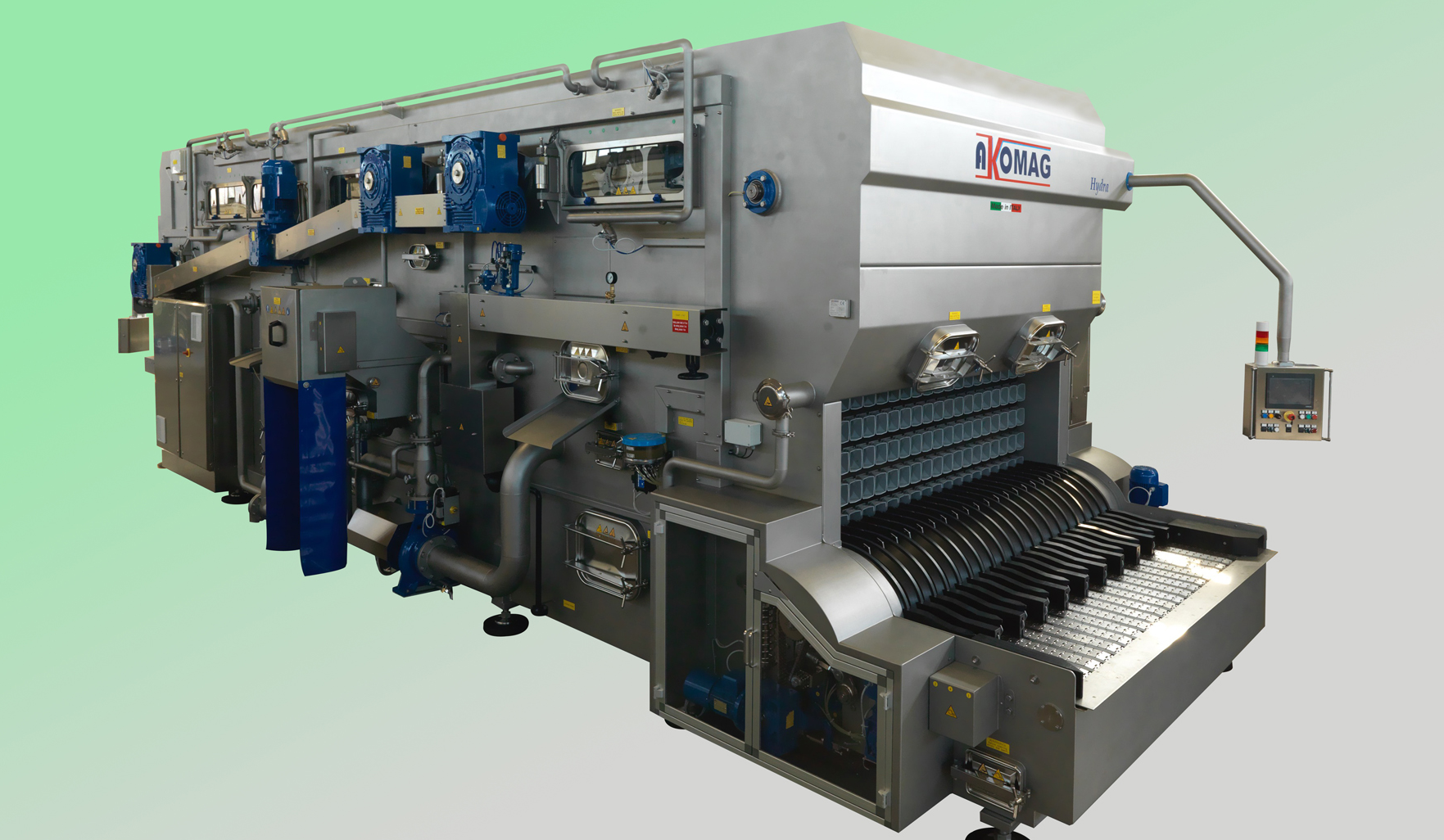 La struttura semplice e modulare della sua produzione ha consentito di aumentare progressivamente le funzioni e il livello di sofisticazione, inserendo sezioni di lavaggio speciali e di sanificazione, il controllo automatico dei parametri di processo, sistemi di sicurezza per l’impianto, il recupero energetico, la riduzione degli scarichi e la sanificazione automatica delle parti più importanti dal punto di vista igienico.