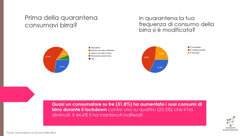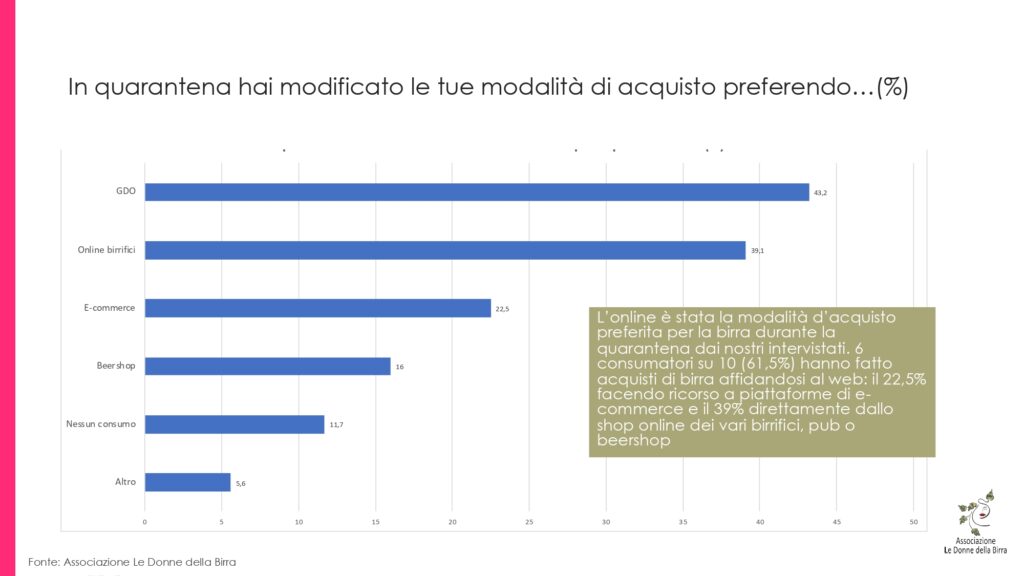 Quasi 1 consumatore su 3 (31,8%) ha aumentato i suoi consumi di birra durante il lockdown e l’online è stata la modalità d’acquisto preferita in quarantena. Il dato emerge da un sondaggio esclusivo realizzato dall’Associazione Le Donne della Birra tra il 23 aprile e l’11 maggio. Dalle 650 interviste raccolte online presso un campione selezionato di consumatori ‘esigenti’ di birra (elevata la presenza di professionisti del settore) è emerso che 6 consumatori su 10 (61,5%) hanno fatto acquisti di birra affidandosi al web: il 22,5% facendo ricorso a piattaforme di e-commerce e il 39% direttamente dallo shop online dei vari birrifici, pub o beershop. A seguire il supermercato, scelto dal 43,2% del totale intervistati, mentre prima si fermava al 36,2%. Il tutto ovviando alla chiusura dei locali pubblici, prima nettamente preferiti dal campione nel 77,9% dei casi.