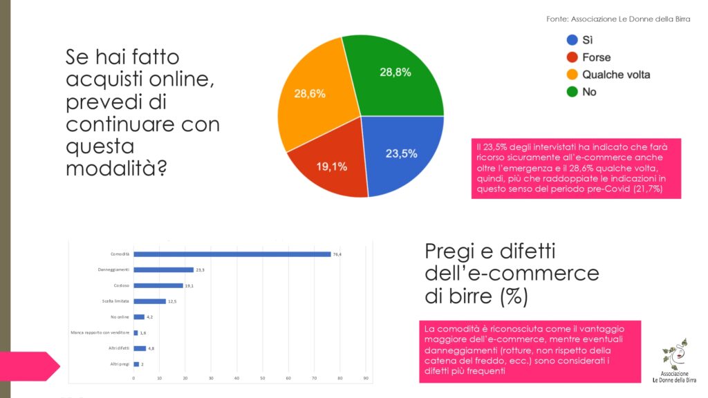 L’online durante la pandemia non ha significato solo e-commerce. La quarantena ha scatenato la fantasia e così sono proliferati gli eventi, dai videoparty ai meeting sulle diverse piattaforme. Uno dei fenomeni più interessanti del settore è stato quello delle degustazioni online. Trattandosi di una nuova modalità di essere in contatto col settore e con la propria passione birraria, solo il 16,8% degli intervistati ha detto di averne seguite, ma il gradimento che hanno ricevuto è davvero incoraggiante per i birrifici e gli esperti che le hanno programmate così come per l’Associazione Le Donne della Birra, che ha sviluppato un intenso palinsesto sotto il titolo #lontanemaunite, attivo fino alla fine di maggio.
