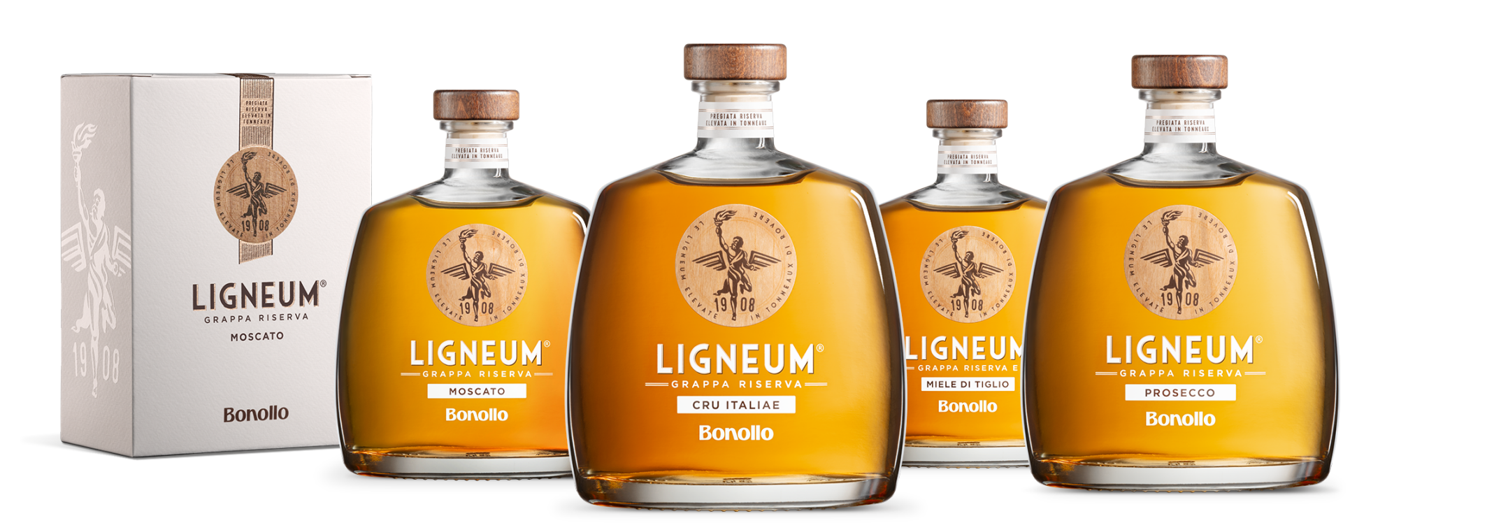 - Ligneum Prosecco: manifesta la morbidezza e la delicatezza del carattere scolpito dai maestri distillatori Bonollo 1908 a partire dalle vinacce da cui si è ottenuto il vino Prosecco. Si distingue per suadenti tonalità speziate e vanigliate e una gamma di delicate note fruttate che esaltano l’eleganza e la franchezza della personalità di questa grappa.
