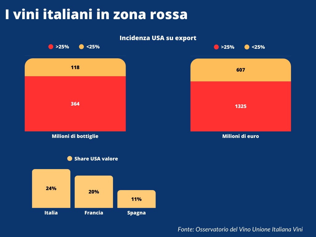Per il segretario generale di Uiv, Paolo Castelletti: «Rispetto ai partner europei, l’Italia presenta due principali fattori di rischio: da una parte la maggiore esposizione netta sul mercato statunitense, pari al 24% del valore totale dell’export contro il 20% della Francia e l’11% della Spagna. Dall’altra, una lista di prodotti più sensibili su questo mercato, sia in termini di esposizione, che di prezzo medio a scaffale: solo il 2% delle bottiglie tricolori vendute in America vanta un price point da vino di lusso, mentre l’80% si concentra nelle fasce “popular”, che tradotto in prezzo/partenza significa in media poco più di 4 euro al litro».