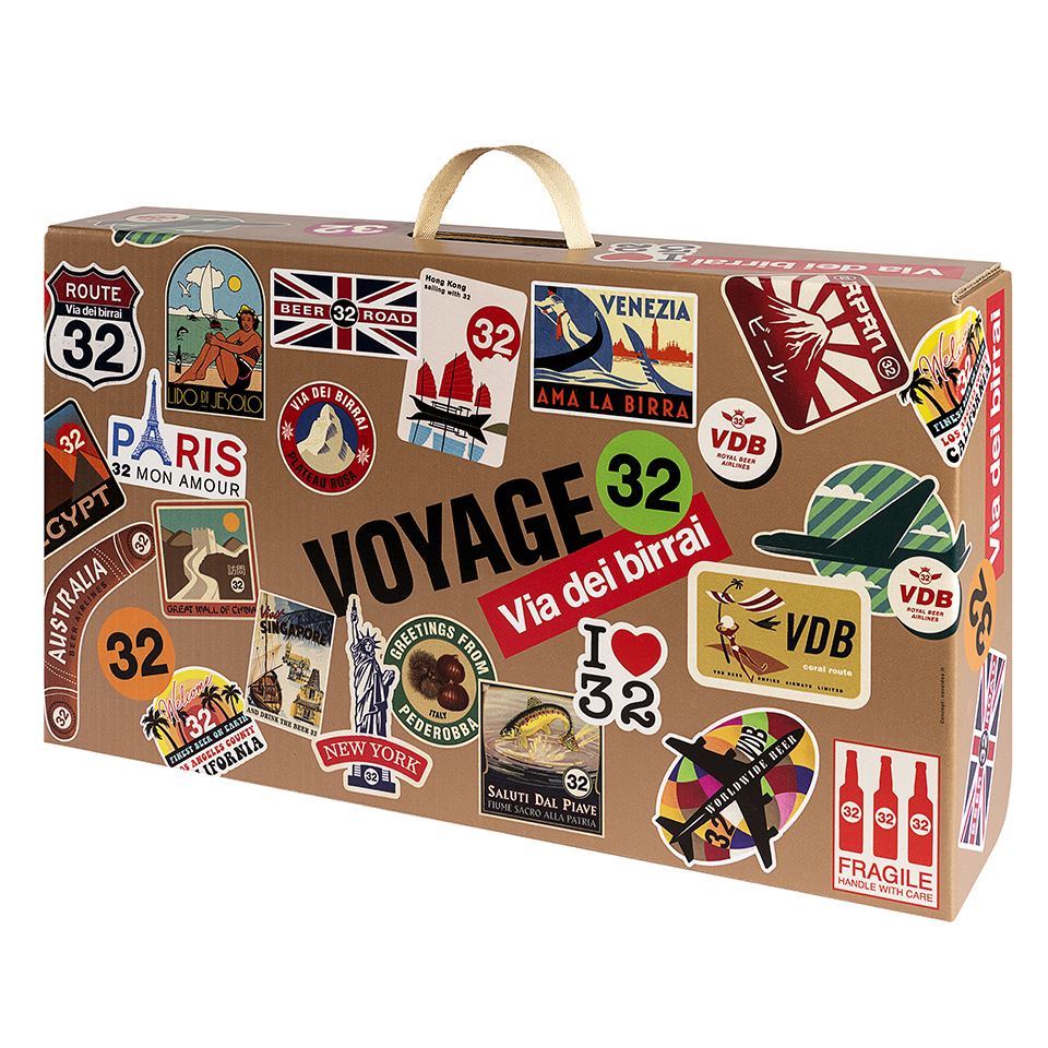 VOYAGE 32 è il nuovo packaging che valorizza la filosofia 32, una valigetta ricoperta di stickers stile vintage per portare con sé i valori intrinsechi di una realtà produttiva che supera i confini dell’ordinario. La confezione racconta simbolicamente il viaggio di 32 Via dei birrai, il percorso che dal birrificio di Pederobba ha portato la birra 32 a raggiungere mete lontane e inaspettate.