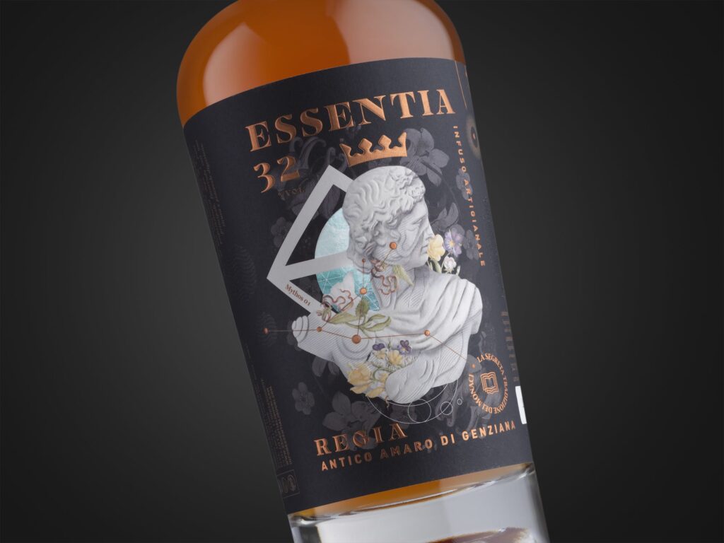 Alla richiesta di Fabio Valtorta, executive chef del ristorante Hespresso di Roma e ideatore di Essentia Regia, ho risposto con un’etichetta che dal punto di vista visivo è ricca di elementi geometrici, figurativi e lettering che si mescolano l’uno con l’altro e restituiscono quell’idea di fusione e miscela che sono proprie dell’amaro. La scultura rappresenta re Genzio in una chiave rivisitata e contemporanea, resa grazie alla scomposizione di alcune porzioni in elementi ondulati e sinuosi. In questo modo la figura sembra staccarsi dal piano bidimensionale e animarsi nel tripudio dei colori delle varie tipologie di Genziana.
