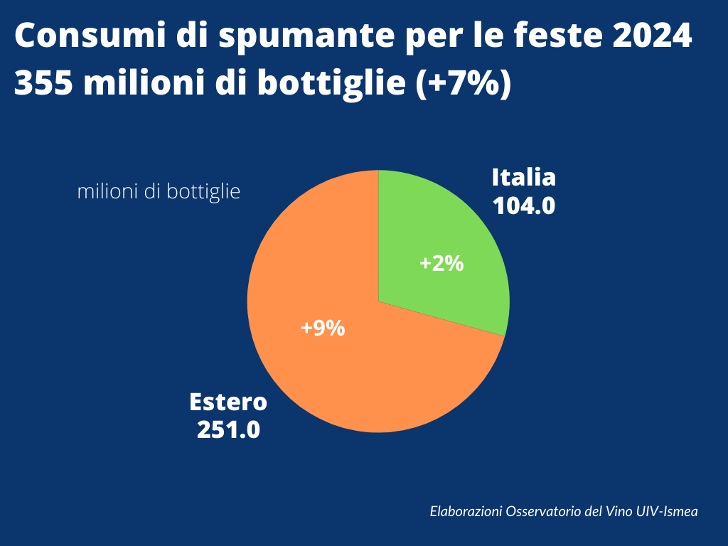 Nel dettaglio, secondo l’analisi targata Unione Italiana Vini e Istituto per i servizi del mercato agricolo alimentare attraverso l’incrocio di fonti ufficiali, tra Natale e Capodanno i consumi di sparkling tricolori si concentreranno soprattutto all’estero con 251 milioni di bottiglie stappate (+9% sul 2023) e 104 milioni in Italia (+2%). In sensibile calo invece il mercato dello champagne, che chiuderà a -8% (5,1 milioni).