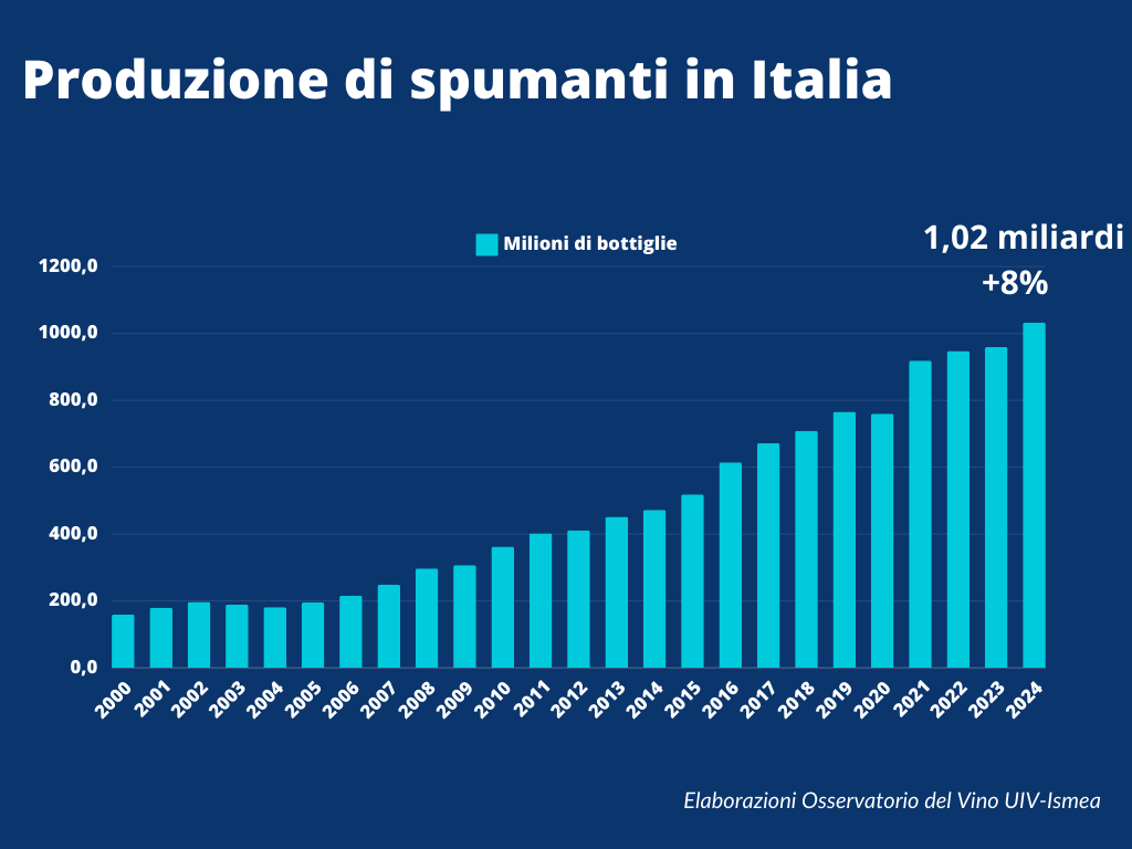 Le bollicine italiane si apprestano a superare la quota record di 1 miliardo di bottiglie prodotte e commercializzate nel 2024; di queste, 355 milioni (+7%) saranno stappate tra Natale e Capodanno in Italia e nel mondo. Un record, rileva l’Osservatorio del vino Uiv-Ismea nel consueto report di fine anno, che dimostra la forza di una tipologia refrattaria a crisi economiche, conflitti e a difficoltà ormai strutturali del settore.