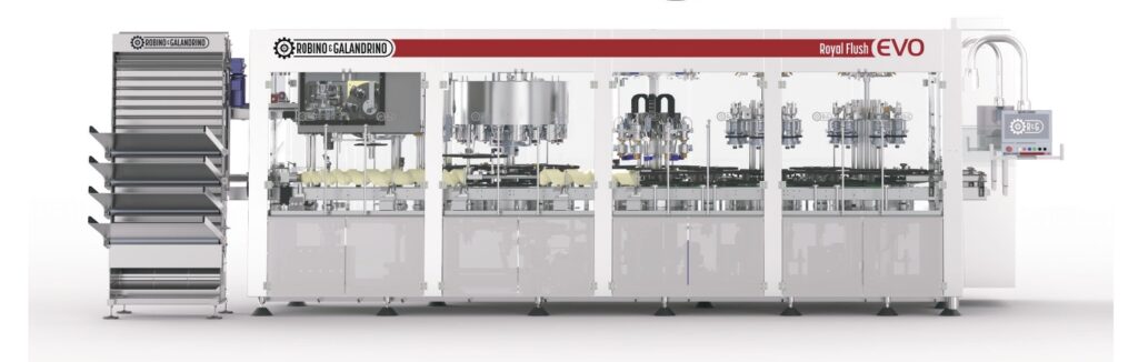 Per quanto riguarda le macchine capsulatrici, R&G ha sviluppato macchine “universali” come nel caso della “ROYAL FLUSH EVO”, progettata per capsulare sia vini fermi che spumanti. La macchina è composta essenzialmente da due sezioni: Sezione vini fermi e Sezione vini spumanti. Il primo carosello è dedicato ai sistemi di visione per l’allineamento delle bottiglie e delle capsule. La piegatura e la lisciatura sono affidate ai due caroselli successivi, che, in linea con la tradizione R&G, sono dedicati. Royal Flush può essere configurata posizionando la sezione spumante prima di quella del vino fermo, consentendo di utilizzare il carosello dedicato anche per la scansione e l’allineamento per la capsulatura del vino fermo.