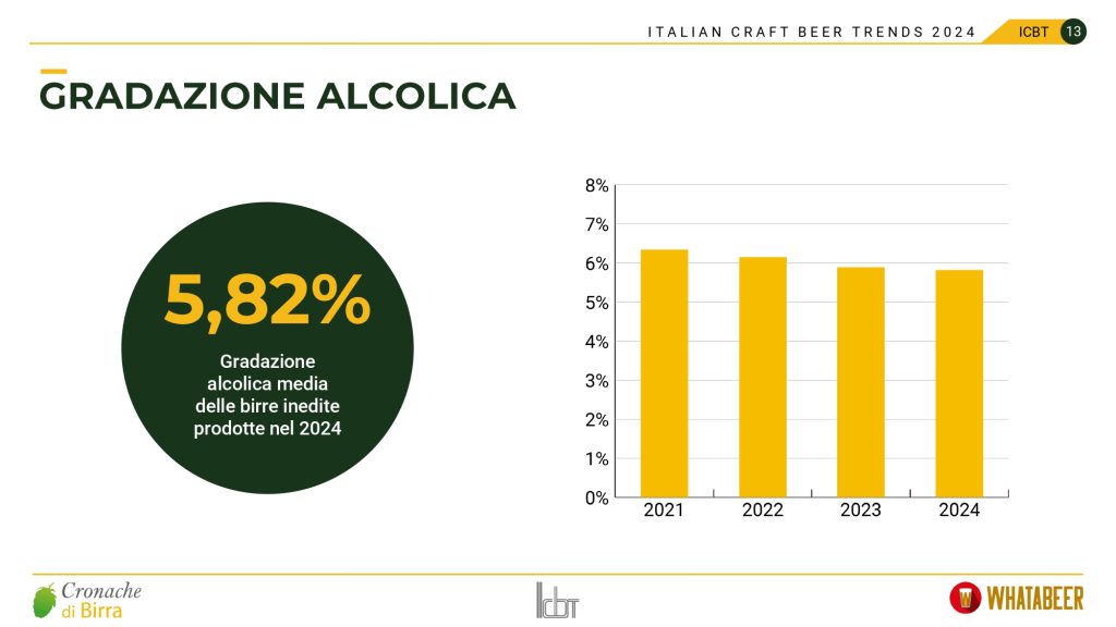 Nel 2024 la gradazione alcolica media delle birre inedite è stata pari al 5,82%, rimanendo praticamente invariata rispetto all’anno precedente (5,89%). Tuttavia, nonostante la differenza sia limitata a pochi centesimi, si conferma la tendenza alla riduzione del volume alcolometrico registrata negli ultimi anni. È comunque un’evoluzione molto lenta, che dimostra la reticenza dei birrifici italiani a rivolgersi al segmento delle NoLo (birre analcoliche o a basso contenuto alcolico). Una maggiore convergenza è attesa nel corso del 2025.