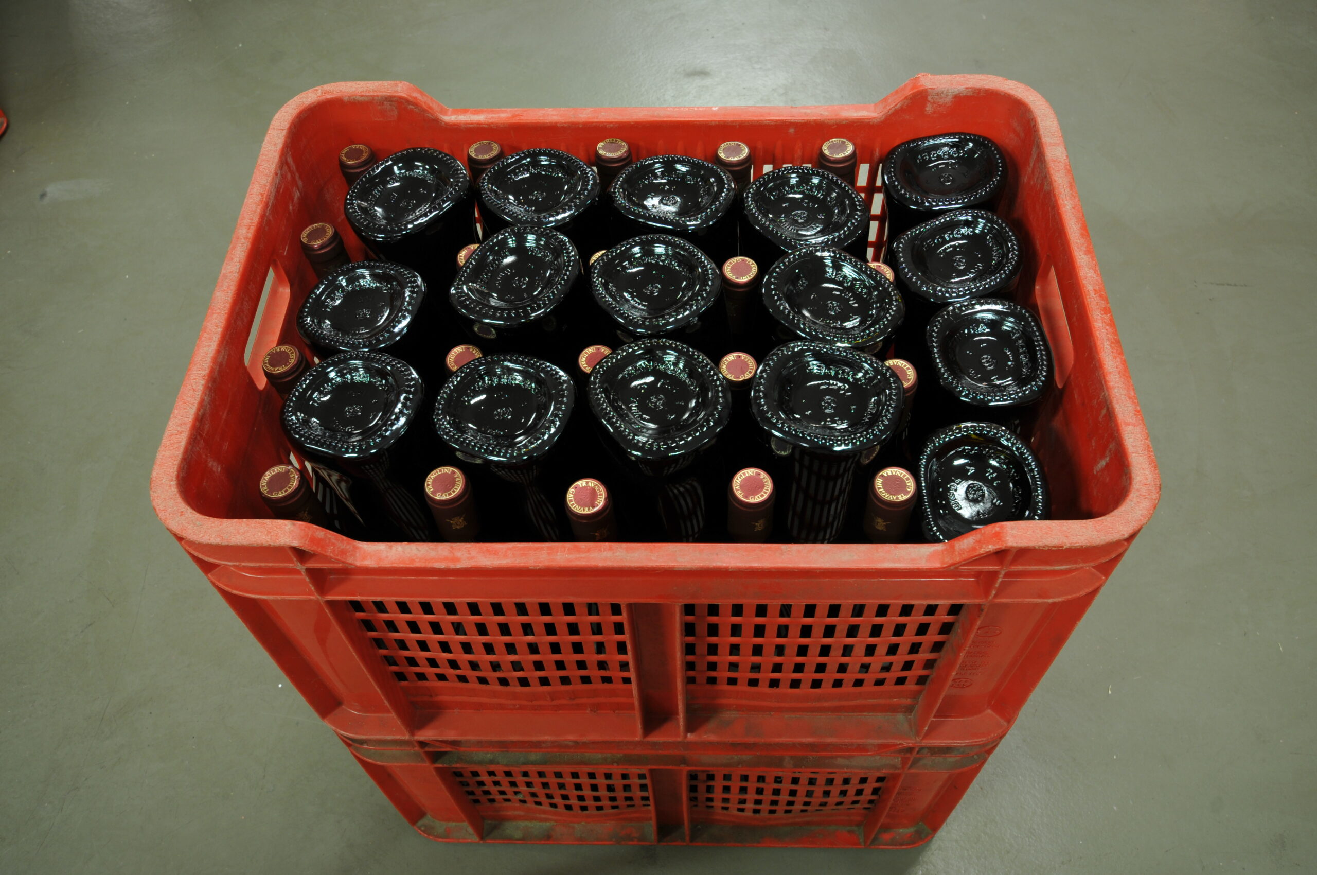 Contribuisce al mantenimento della qualità dei prodotti Travaglini il colore scuro della bottiglia che ostacola il passaggio dei raggi luminosi, a causa dei quali si potrebbe generare il classico “difetto di luce”. È tuttavia evidente che la forma distintiva della bottiglia impone alcuni vincoli durante il confezionamento, soprattutto quando la si deve “vestire”. Il suo perimetro di base non perfettamente circolare, ben evidente quando la si capovolge per inserirla nelle ceste a fine linea, richiede infatti un supplemento di manualità nel passaggio dalla capsulatrice all’etichettatrice e piattelli costruiti su misura all’interno della macchina affinché il contenitore mantenga la corretta posizione mentre vengono applicati sulla superficie di vetro i quattro componenti adesivi: etichetta frontale, retro etichetta, collarino con l’annata e fascetta Docg.