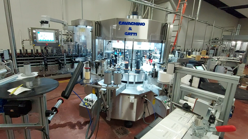 L’etichettatrice fornita a Cantine Torrevento è il modello CG-BL-12-4XPSHi-SFGD-5-MP e a illustrarla è Renato Savio, Sales manager di Cavagnino & Gatti: «Questa macchina è caratterizzata da: 12 piattelli motorizzati, che assicurano una movimentazione precisa e stabile delle bottiglie durante il processo di etichettatura; 4 stazioni adesive XPSHi, che permettono l’applicazione di diverse etichette in carta autoadesiva (girocollo, etichetta di corpo, bollino frontale e controetichetta) su bottiglie di vino cilindriche e coniche di varie dimensioni, da 187 a 1500 ml; orientamento ottico a doppia fotocellula SFGD che garantisce un orientamento preciso rispetto a vari riferimenti, come giunzione del vetro, marchio del vetro, ricentraggio rispetto a un’etichetta già applicata, tacca UV e tacca colorata sulla capsula; produzione oraria fino a 10.500 bottiglie; predisposizione per inkjet (sulla stazione della controetichetta, consentendo l’integrazione di sistemi di stampa a getto d’inchiostro per la codifica); svolgitori motorizzati a doppia bobina, ovvero tre svolgitori motorizzati che rendono possibile il cambio delle bobine delle etichette senza lo stop della macchina, per una produzione continua e priva di interruzioni».
