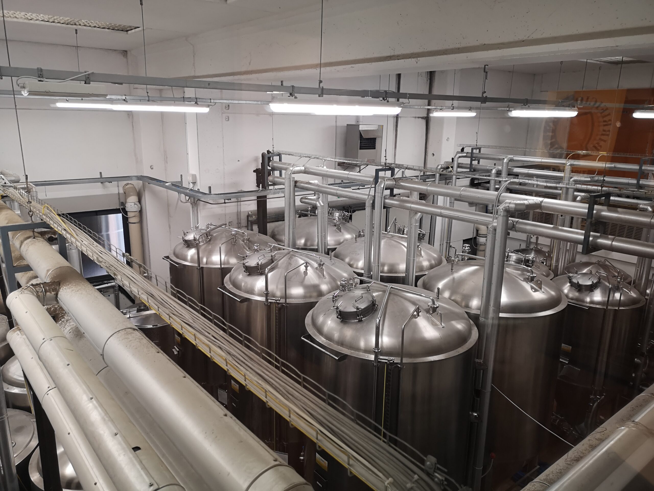 Utilizzando il sistema Unitank, il mosto viene poi trasferito in serbatoi cilindro-conici dove avvengono sia la fermentazione che la maturazione. Non si utilizzano né filtri né centrifughe, ma solo decantazione statica a freddo per almeno quattro settimane, nel corso della quali vengono effettuati numerosi spurghi. Il materiale recuperato viene stoccato in un serbatoio posto all’esterno del birrificio e venduto a un allevamento di maiali, che lo impiega nella loro alimentazione. La lagerizzazione ha luogo a una temperatura di +2°C, non più bassa, per ridurre l’incidenza del consumo energetico da produzione di frigorie.