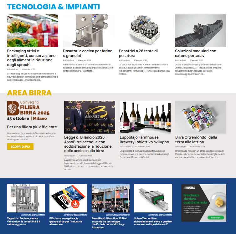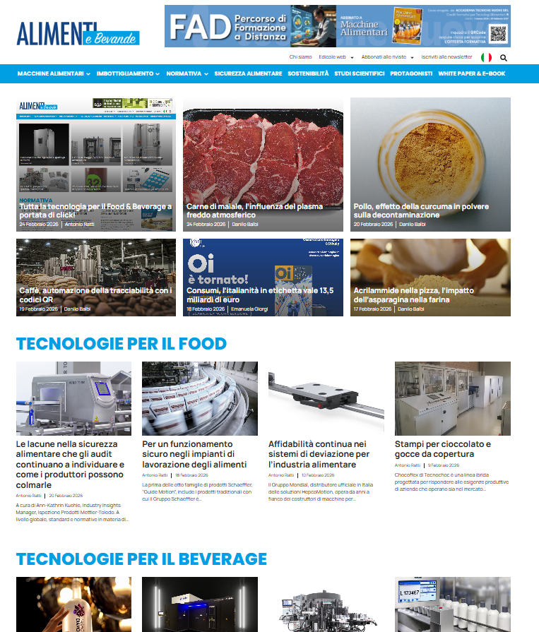 Alimentibevande.it si propone come piattaforma di riferimento per il mondo del Food & Beverage, con approfondimenti relativi a tecnologia e impianti, ricerca, studi scientifici, normativa, sicurezza alimentare, Area Birra, sostenibilità e molto altro.