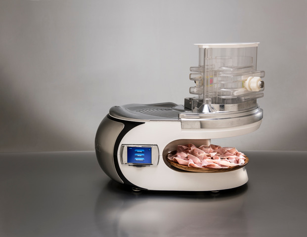 Easydea propone una macchina elettronica che unisce le funzioni di affettatrice automatica a quelle di bilancia, porzionatrice, sottovuoto. In dotazione ha un software simile a quelli installati su macchine industriali o robot per produzioni complesse, il quale controlla i sistemi di sicurezza.