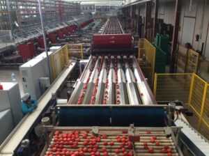 Si tratta di due Rollestar progettate per prodotti con diametri di 40/110 mm, che lavorano a velocità di 15 f/s. I pomodori rimangono nell’unità durante le fasi di rotazione sotto il sensore di qualità, pesatura e consegna alle uscite, per consentire alla macchina di analizzare con precisione prodotti che transitano alla massima velocità.