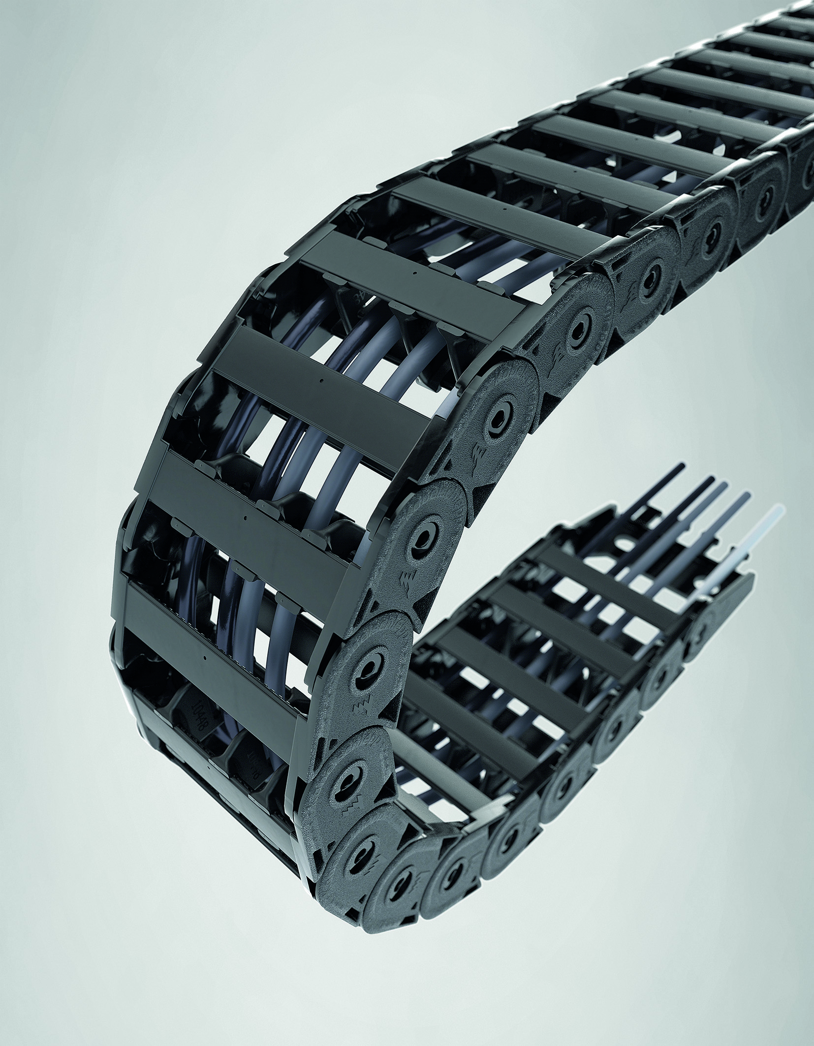 Leggere, silenziose e con un ampio spettro applicativo, le catene portacavi Uniflex Advanced di Kabelschlepp hanno forme esecutive con traversini apribili sul lato interno o esterno, traversino10 RMA, maglie in un unico pezzo (forma 020), molteplici opzioni di suddivisione dei cavi, semplice fissaggio dei separatori, superfici laterali antiusura e un rapporto favorevole fra larghezza interna ed esterna.