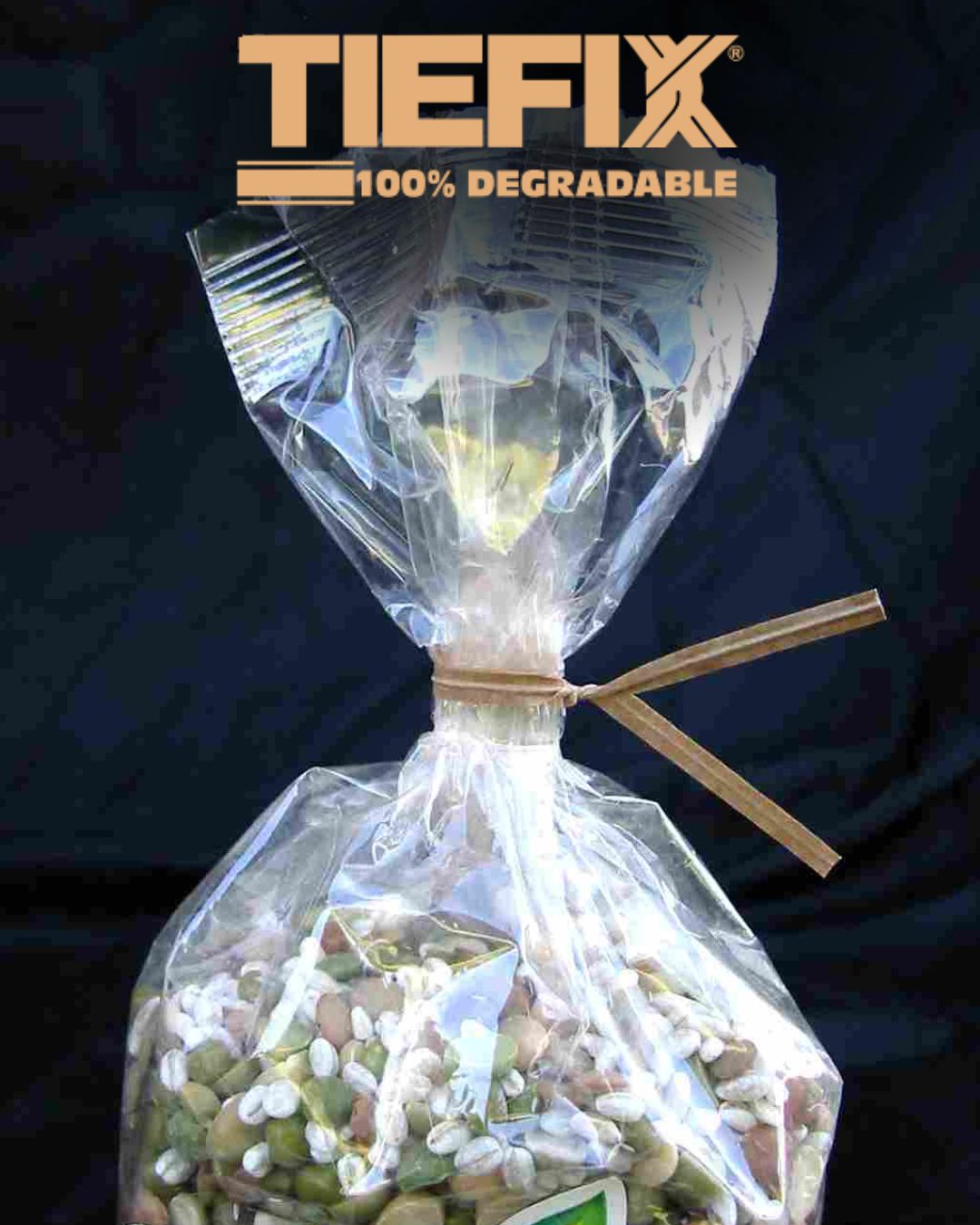 Ma la novità più recente è Tiefix-2Ki di carta biodegradabile al 100%, pensata per vestire con un look ecologico pane, biscotti e pasta. La foto mostra la versione di carta del celebre filo animato per legature twist rivestito con plastica. Una configurazione che rende questa chiusura ermetica per sacchetti completamente biodegradabile.