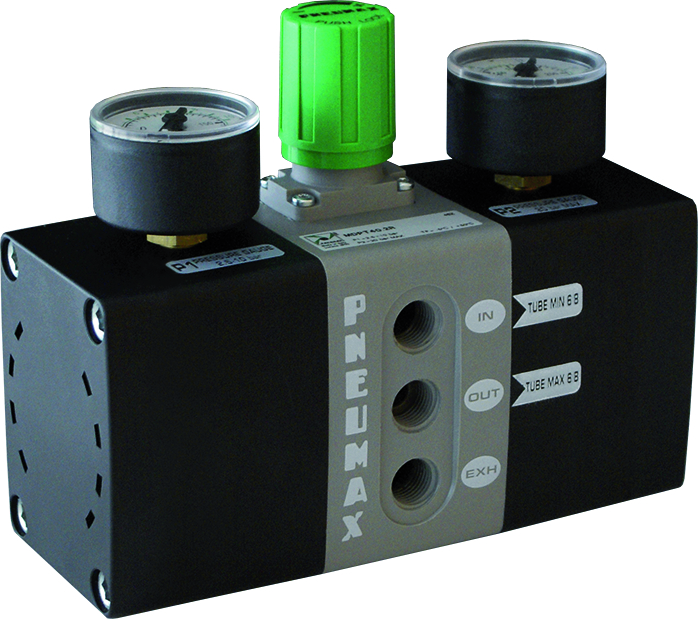 I prodotti Pneumax offrono efficienza operativa in ogni applicazione. L’ampia gamma permette di selezionare la giusta taglia di ogni componente e comprende attuatori, valvole e accessori impianto che assicurano il miglior risultato in termini di prestazioni e ingombri. Per spazi limitati, per esempio, vi sono i cilindri compatti Ecoflat con forma interna del tubo a sezione rettangolare. Disponibili in versione base e con stelo passante e filetti maschio o femmina, possono essere dotati di pistone magnetico e non. Tutti hanno paracolpi elastici antirumore. La foto mostra un moltiplicatore di pressione, caratterizzato da un design compatto e pulito. Anch’esso con dimensioni di ingombro e peso ridotti, utilizza come fluido motore la stessa aria compressa dell’impianto pneumatico. Non necessita di alimentazione elettrica, è facile da installare e permette di incrementare il valore della pressione di esercizio in qualsiasi punto dell’impianto, mantenendo il resto alla pressione di linea.