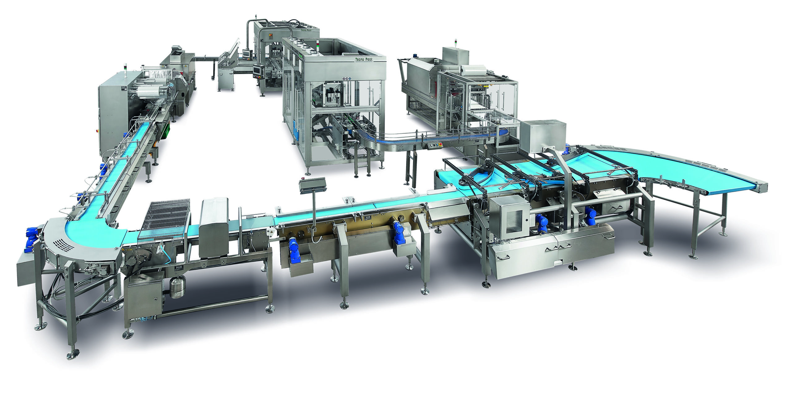 L’impianto automatico Tecno Pack Full Inox IP 65 per hamburger surgelati include il sistema di alimentazione automatica ad alta velocità del prodotto sfuso, la confezionatrice orizzontale elettronica flowpack FP 100 in versione shrink, il tunnel di termoretrazione TT a tre camere, la stazione di alimentazione robotica per l’astucciatrice completa di due robot Delta.