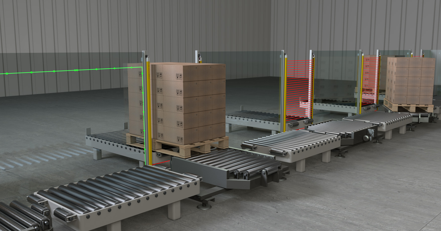 La protezione per i trasportatori di pallet ha lo scopo di impedire alle persone di entrare nell’area pericolosa e al contempo consentire il trasporto di materiale all’interno di queste aree. I principali vantaggi delle cortine fotoelettriche sono: design compatto vista l’assenza dei sensori di trigger supplementari; transito affidabile del materiale trasportato; nessun intervento di assistenza per l’allineamento dei sensori di trigger.