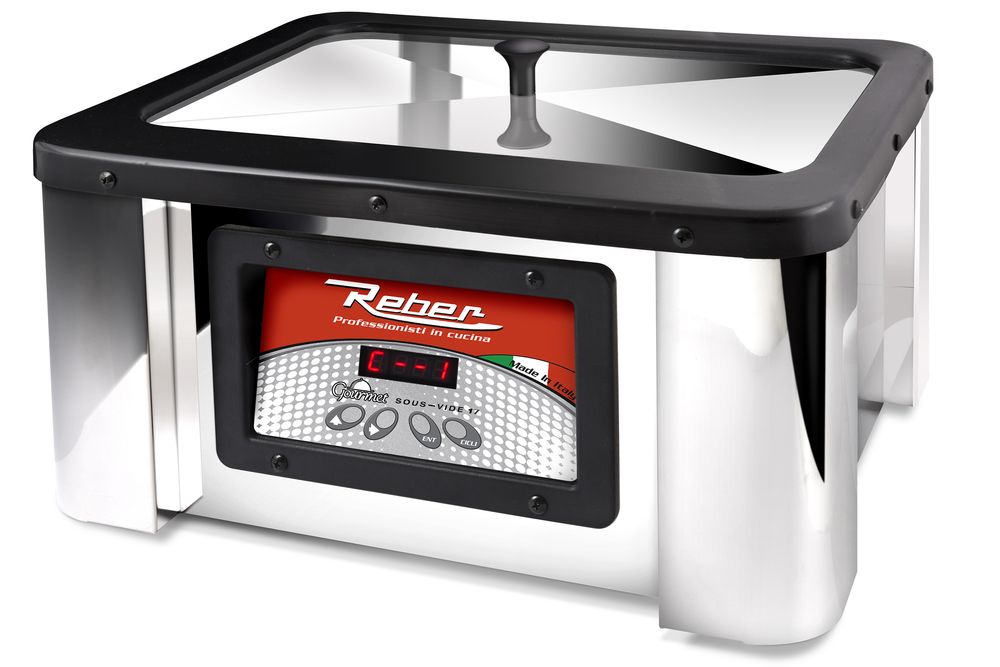 L’apparecchio per cottura sottovuoto Gourmet Sous-Vide è prodotto in Italia da Reber. E’ costituito da vasca di materiale plastico termoresistente con resistenza interna protetta da fondo d’acciaio; sonda di controllo temperatura con grado di precisione 0,5°C; scheda elettronica con 14 cicli di cottura. Di questi, nove sono preimpostati e cinque personalizzabili, modificabili e memorizzabili dall’utente. La carcassa esterna crea una camera isolante che mantiene costante la temperatura dell’acqua. Il coperchio d’acciaio di forma convessa impedisce l’evaporazione e lascia cadere ai lati della vasca le gocce di condensa, che riprendono immediatamente la temperatura. La resistenza nella vasca agisce per convezione, riduce la dispersione di energia e garantisce la temperatura uniforme. La resistenza a diretto contatto con l’acqua cuoce gli alimenti senza ricircolo forzato, consentendo di riempire la vasca fino al 70% della capienza (10/17 litri). Il ritardo di accensione permette di preparare l’apparecchio con gli alimenti e programmarlo. Due i modelli disponibili: il più grande consuma meno di 60 W, il più piccolo meno di 40 W. La bassa temperatura di cottura impedisce la coagulazione dei protidi conferendo morbidezza alla carne. La mancata esposizione diretta alle fonti di calore e ai liquidi di cottura preserva il gusto degli alimenti.