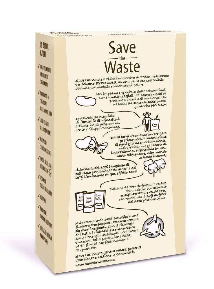 Save-The-Waste_BrochureDa un’idea di Pedon nasce la prima carta per packaging alimentare derivata dagli scarti della lavorazione dei fagioli, eco-sostenibile, 100% riciclabile, frutto del progetto Save the Waste, un modello economico virtuoso e circolare, che fa bene all’ambiente e alla comunità. L’edizione 2015 della Lenticchia Pedina sarà proposta al consumatore già in questa versione.