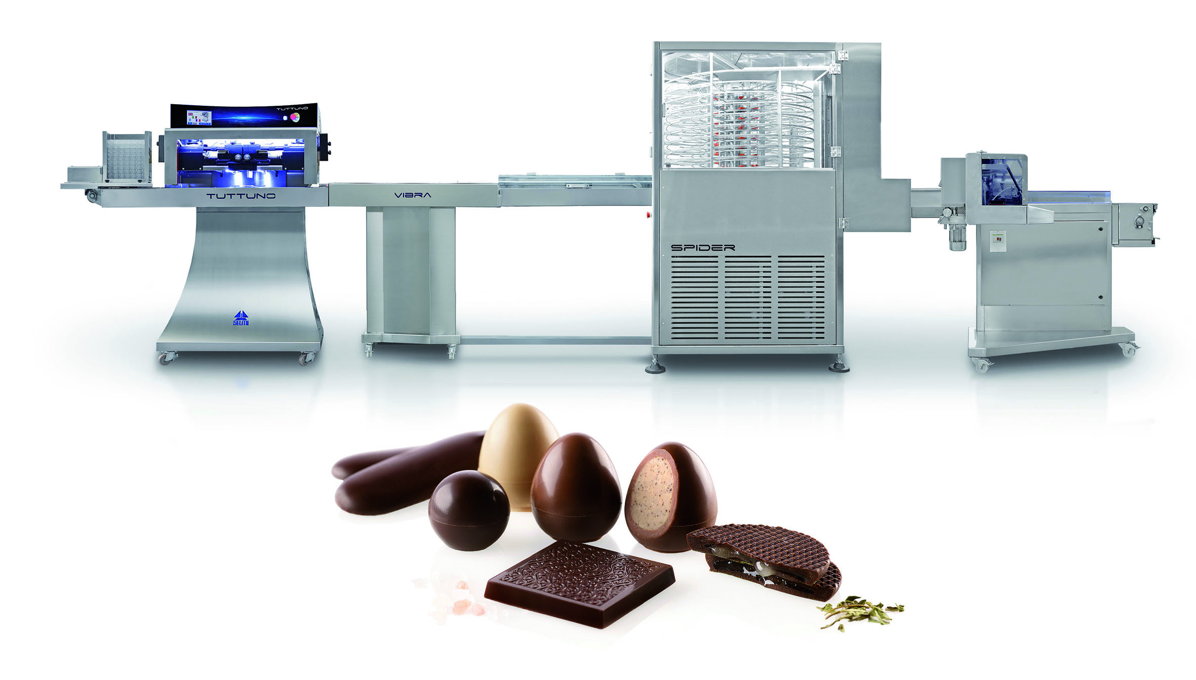 La temperatrice, posta dietro, alimenta a ciclo continuo il cioccolato. Il ripieno può essere erogato dalla tramoggia termoregolata sulla testata della macchina o a ciclo continuo dalla temperatrice a lato. La macchina è abbinata al tunnel di raffreddamento verticale Spider, che ha dimensioni ridotte ma può contenere più di 120 stampi.