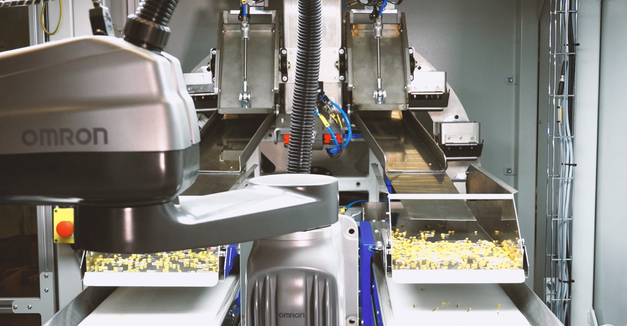 A questo punto, un sistema di visione analizza i terminali e identifica quelli posizionati correttamente. Solo questi vengono prelevati da un robot SCARA, dotato di una precisa pinza a due dita, e posizionati accuratamente nella postazione di lavoro in cui verranno poi crimpati sui fili. Questo rende l’intero processo completamente automatizzato e altamente flessibile, supportando diversi tipi di fili e terminali senza dover fare cambi costosi.