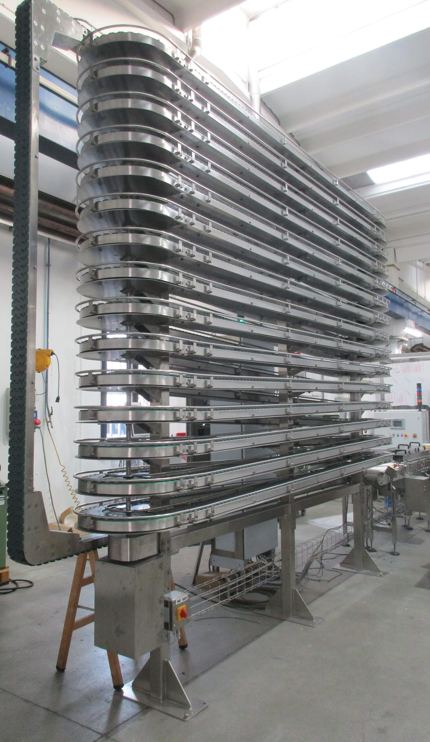 La situazione peggiore è naturalmente che la macchina debba essere sostituita integralmente. Il secondo problema, che ha maggiore impatto per chi come M.H. Material Handling fa nastri trasportatori, è che si riduce se non addirittura scompare la possibilità di accumulo dei prodotti. Insieme ai problemi, come sempre si presentano anche delle opportunità e in questo caso si può procedere a suddividere la produzione richiesta su un maggior numero di macchine più lente a partire dai disimpilatori di vaschette che a questo punto lavoreranno su un numero maggiore di colonne.