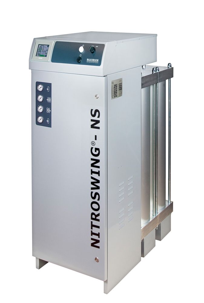 I generatori di azoto Nitroswing forniscono il gas necessario in totale sicurezza, automaticamente, con costi minimi e secondo la portata, la pressione e la purezza necessaria. Le principali innovazioni introdotte da Noxerior riguardano la possibilità di aumentare o ridurre la quantità di gas erogato direttamente in loco, tramite poche e semplici operazioni e senza sostanziali modifiche al sistema, e il risparmio energetico legato all’impianto di aria compressa che alimenta i generatori. La modularità dei generatori permette di ampliare la portata di gas con l’aggiunta di uno o più moduli. Il risparmio energetico è assicurato dal sistema FlatFlow, che ottimizza il processo di alimentazione dell’aria, portando questi generatori ad avere il più basso consumo di aria rispetto alla quantità di azoto prodotta. Questa innovazione permette di dimensionare il sistema di aria compressa a monte del generatore, utilizzando componenti con consumo energetico minore rispetto agli standard sul mercato, con conseguente risparmio sui costi di esercizio dell’impianto.