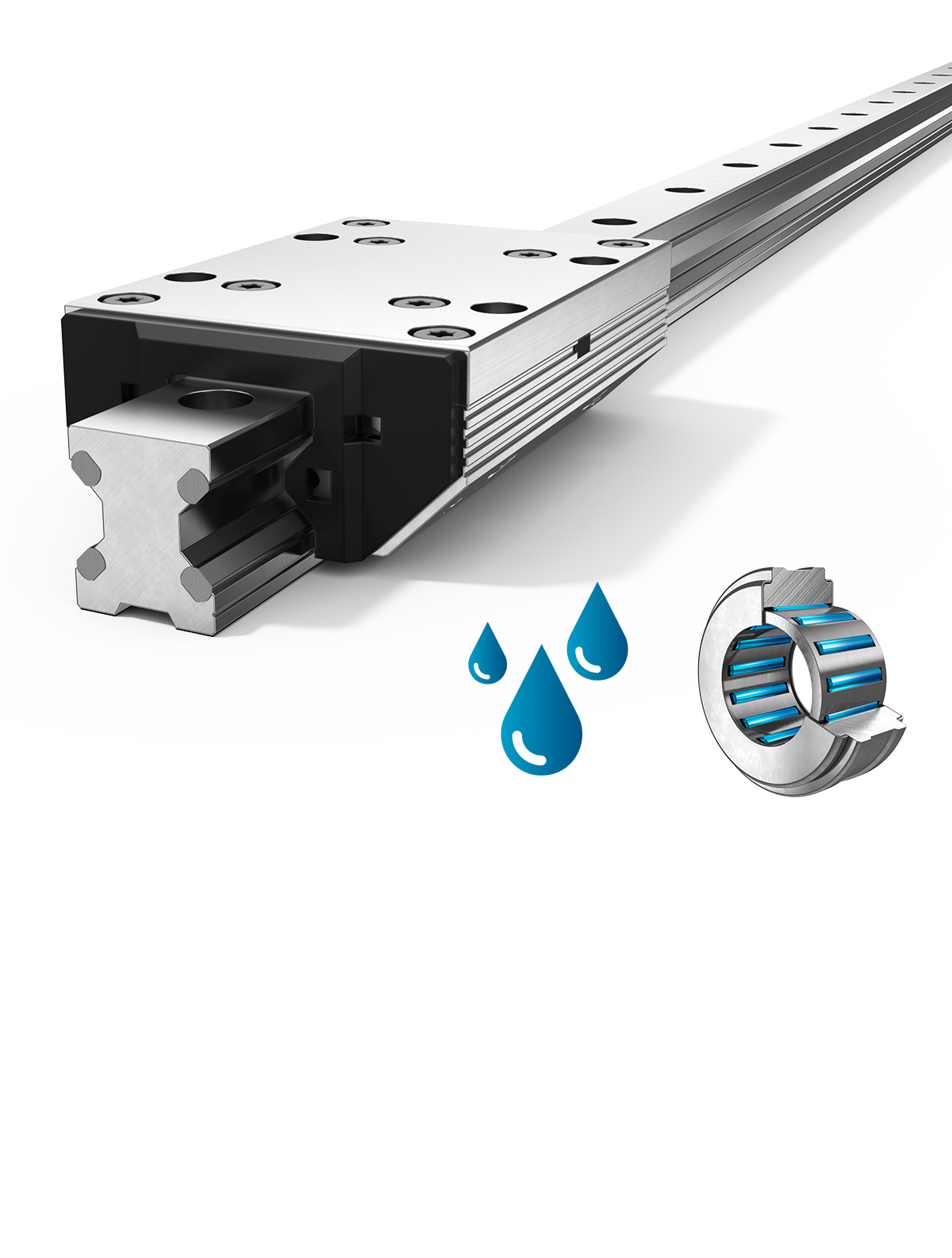 La rotaia d’alluminio è equipaggiata con vie di scorrimento d’acciaio inossidabile su cui scorrono i cuscinetti a rullini del cursore. Anche questi ultimi sono realizzati in acciaio inossidabile. La resistenza alla corrosione non è sufficiente a garantire un funzionamento compatibile con l’ambiente alimentare. Anche la lubrificazione è un aspetto fondamentale, e non ci deve essere possibilità di contaminazione.