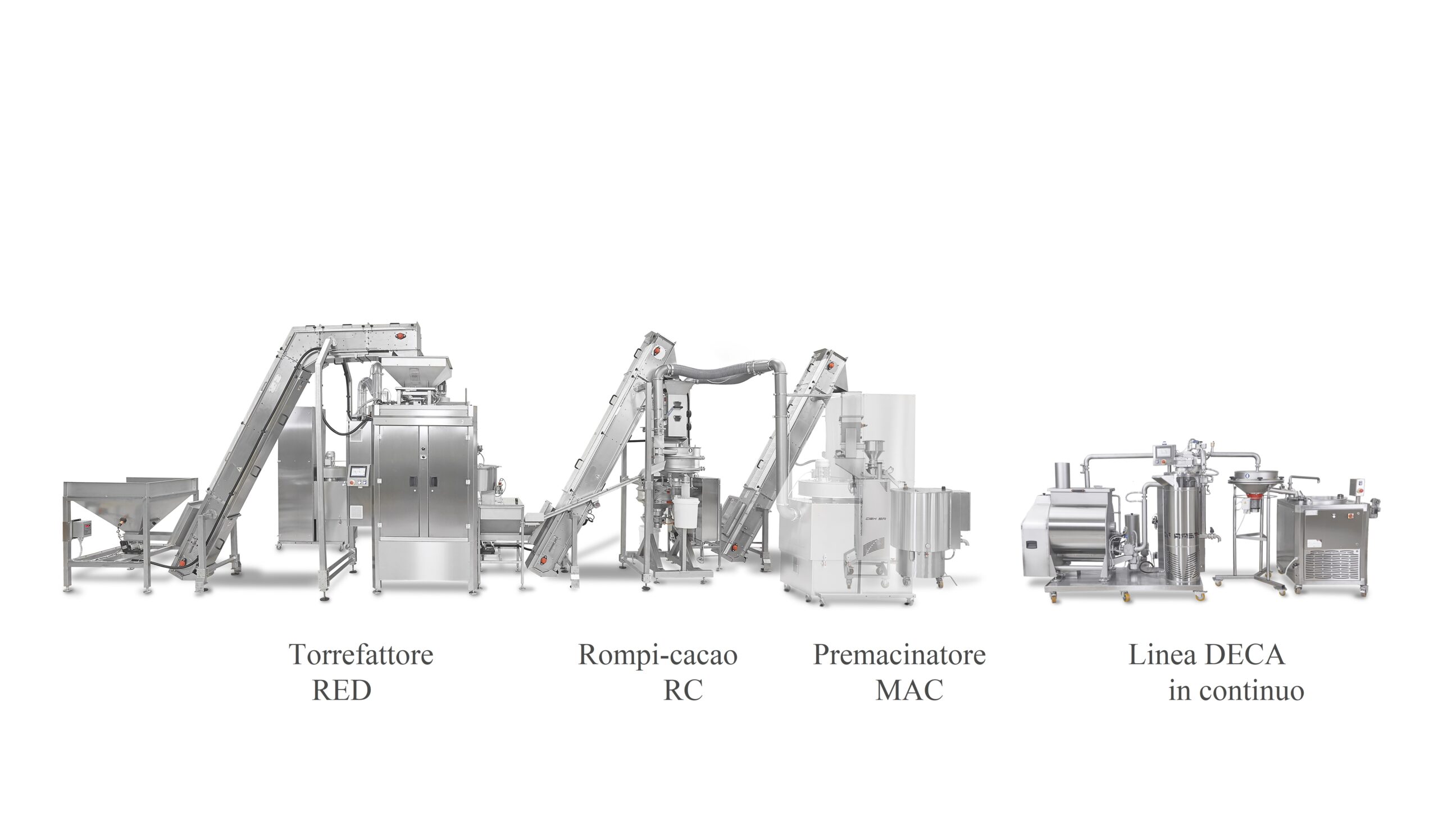 Quindi nell’unità di premacinazione avviene la produzione del liquore di cacao o della pasta pura di frutta secca. La linea Deca 50CR600C effettua le fasi di miscelazione, concaggio e raffinazione per la produzione di cioccolato, creme spalmabili eccetera.