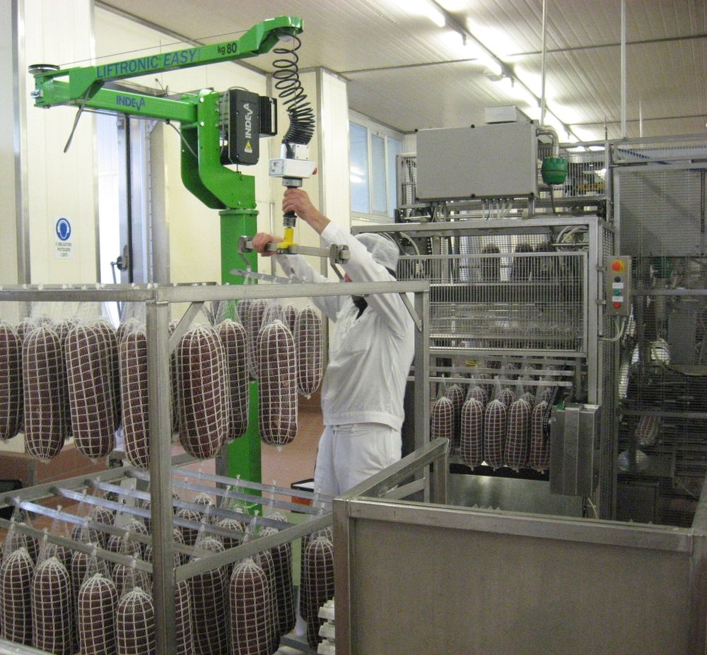 I produttori di salumi sono generalmente dotati di linee automatiche che terminano con confezionatrici in rete di plastica. Ogni 20 sec, tali confezionatrici portano all’uscita una bilancella con quattro bresaole, che l’addetto deve prelevare e posizionare su un carrello. Ogni confezione di bresaola ha un peso variabile da 4 a 12 kg, per un totale da 17 a 49 kg. In una giornata si deve movimentare un peso elevato con una certa velocità, quindi è necessario dotare la postazione di lavoro di un ausilio alla movimentazione manuale dei carichi, per garantire sicurezza ed ergonomia. Una soluzione è il manipolatore industriale Liftronic Easy a controllo elettronico. Prodotto da Indeva in configurazione autobilanciante, si adegua istantaneamente al peso del carico sollevato, si muove alla velocità richiesta dall’operatore senza forze d’inerzia da contrastare. Non ha pulsanti da tenere premuti, ha una corsa verticale di 2,8 m ed è leggero anche nella traslazione sull’asse orizzontale. Il manipolatore può essere montato su colonna, con un braccio articolato di diverse lunghezze, oppure su vie di corsa aeree.