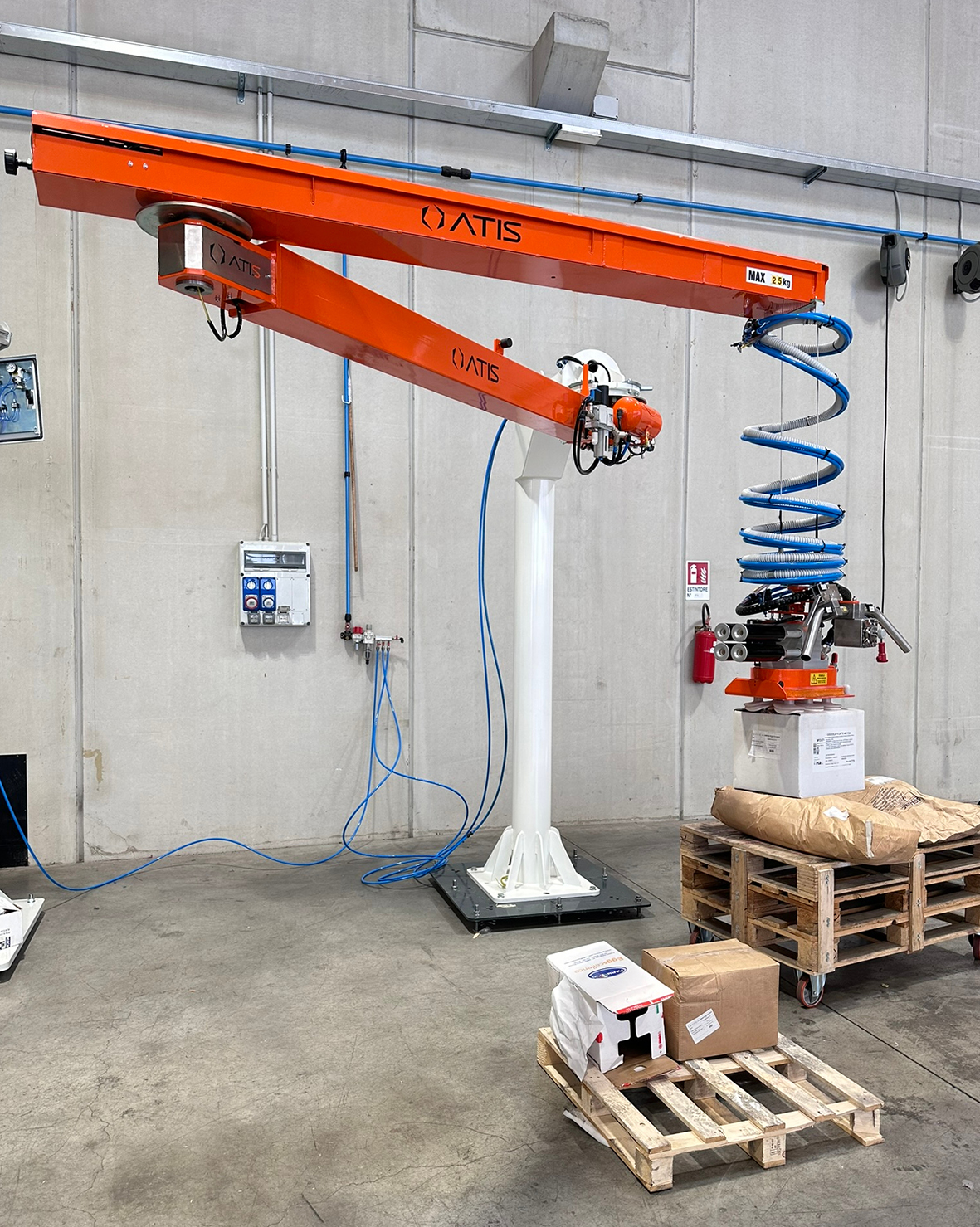 Grazie alla tecnologia pneumatica, caratterizzata da movimenti fluidi e controllati, l’operatore può sollevare e movimentare scatole di diverse dimensioni senza sforzo, riducendo affaticamento e rischi ergonomici. I sistemi di presa, ventose performanti, pinze dedicate o utensili personalizzati, garantiscono la stabilità anche sulle superfici delicate o irregolari tipiche degli imballi alimentari.