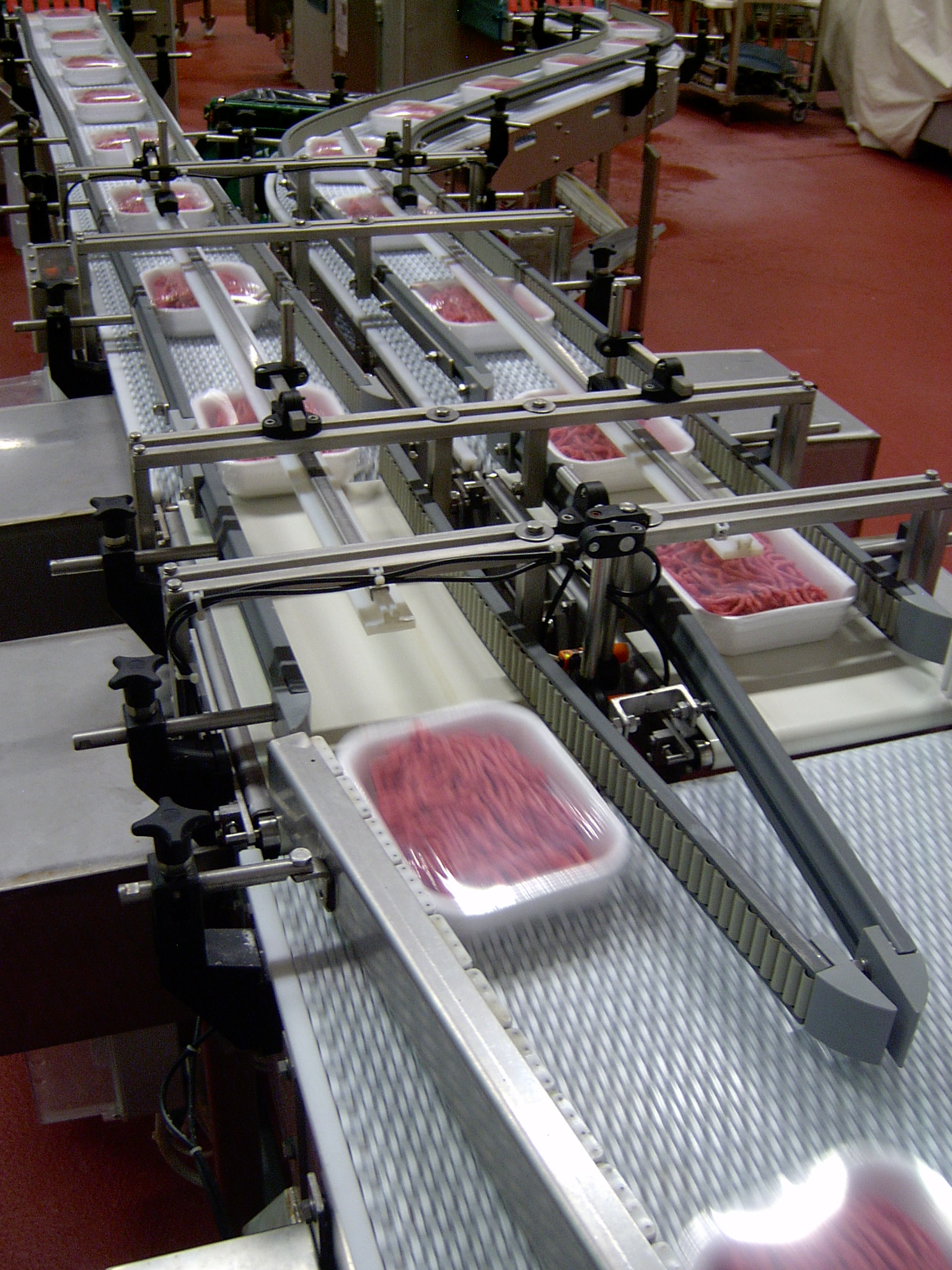 Una volta alimentate le porzionatrici con le cassette per mezzo di nastri trasportatori lavabili, il prodotto nudo, o al massimo appoggiato su sottili fogli di film flessibile, arriva alle termoformatrici o termosaldatrici.