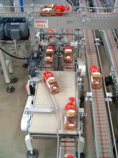 Al contrario il pane nelle sue varie forme molto raramente presenza un imballo secondario intermedio e viene gestito direttamente in cartone se destinato agli scaffali della grande distribuzione o in cassetta se destinato all’HORECA. In questo caso è più tipico vedere sistemi di unificazione e di stratificazione prodotto, di solito il prodotto più “maltrattabile” consente accumulo con pressione; associato con cadenze produttive più ridotte questo rende più raro vedere dei buffer senza pressione.