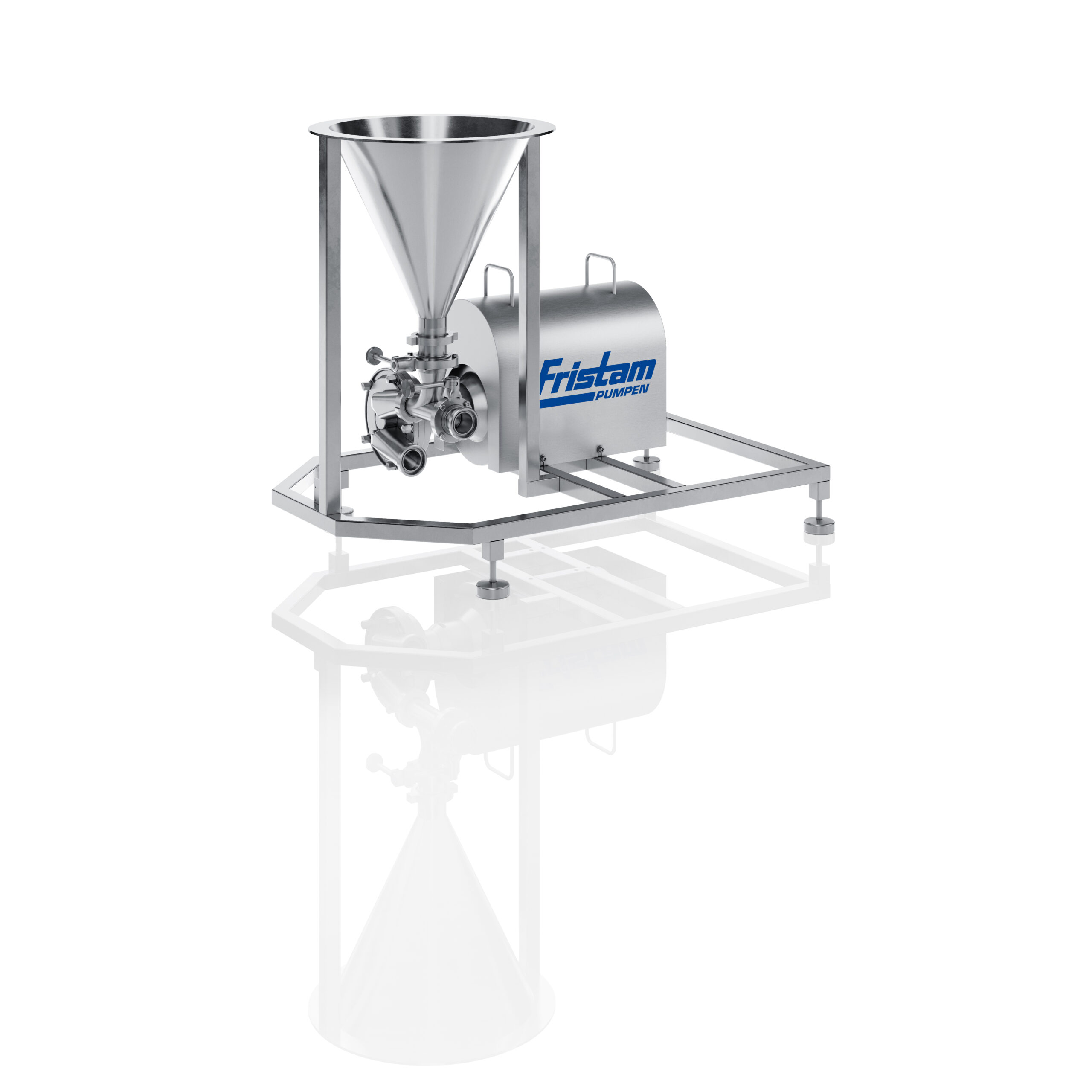 Fristam Powder Mixer. Utilizzato per miscelare in tempi molto brevi elevate quantità di: gomma xanthan, guar, pectina, CMC, farina di semi di carrube, ecc. fino a concentrazioni molto elevate e con viscosità >100.000 cP.