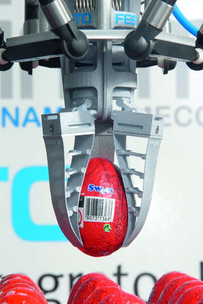 FESTOLa pinza adattiva DHDG Festo permette la manipolazione delicata e controllata di alimenti sensibili alla compressione, in modo rapido e affidabile, grazie al cosiddetto “Fin Ray effect”. La pinza bionica adattiva, leggera e flessibile, è costituita da un attuatore pneumatico a forma di soffietto e tre dita di presa disposte come nella pinna caudale di un pesce. La struttura base è realizzata con due bande flessibili unite a triangolo. A intervalli regolari vi sono sostegni intermedi collegati tramite giunti articolati. Questa configurazione permette alle dita di presa di adattarsi alla forma di un oggetto, regolando la pressione come la mano umana. Ma molto più velocemente. La pinza adattiva è realizzata con procedimento SLS (sinterizzazione laser selettiva), in cui vengono applicati strati successivi di polvere poliammidica dello spessore di 0,1 mm che poi solidificano a formare un componente solido. Questo riduce il peso che grava sul portautensili del 90% rispetto alle pinze convenzionali di metallo.