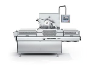 Tutti i componenti della linea sono perfettamente e integrati tra loro. Allo stand Meat Tech è esposta una linea costituita dal sistema di porzionatura multifunzionale GMS 520 singlecut e AIR 520 flexload TVI con termosaldatrice T 600 L (in foto). La T 600 è la più piccola termosaldatrice completamente automatica di tra quelle alimentate da un nastro a tappeto, e può quindi essere facilmente integrata in una linea di confezionamento.