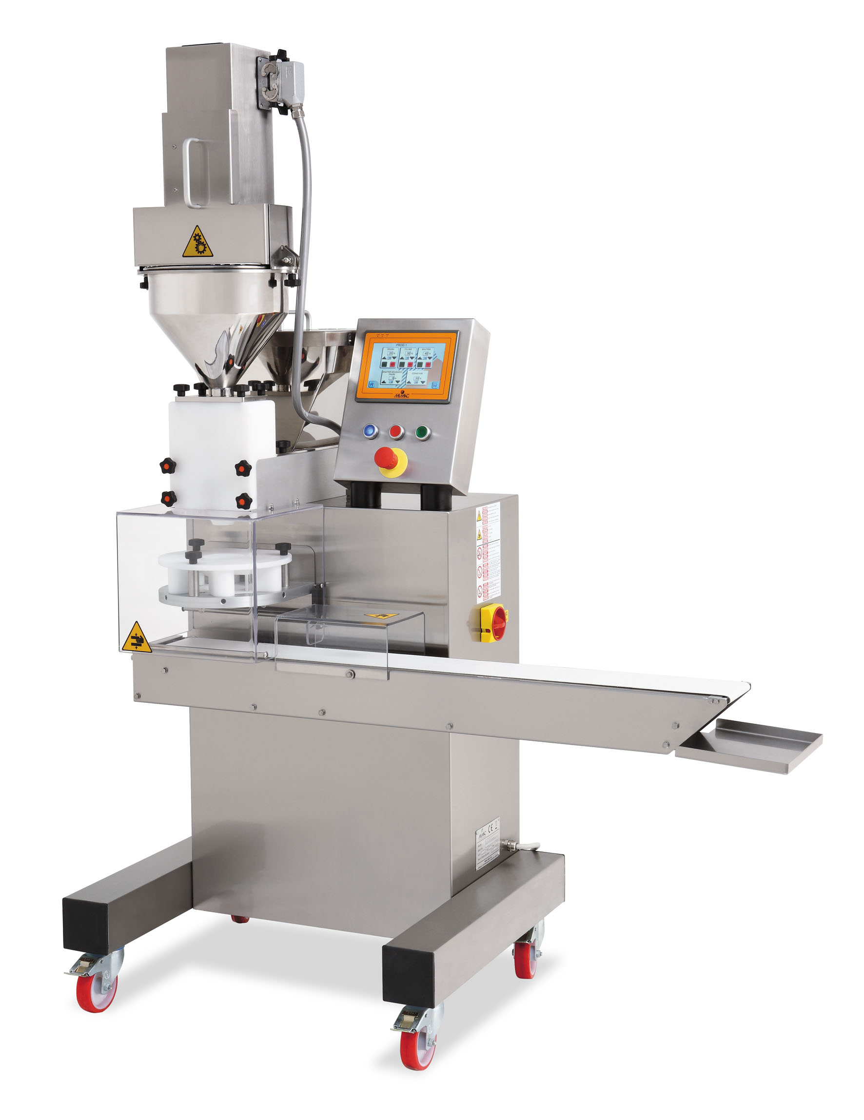 In dotazione il touch screen a colori da 7” di facile utilizzo, che permette all’utilizzatore di memorizzare fino a 200 ricette. La capacità produttiva è di 6000 pezzi/h da 25 g e 750 pezzi/h da 200 g. Le principali dotazioni sono le seguenti: gruppi di dosaggio per pasta e ripieno; kit otturatore a diaframma per taglio prodotti con forme diverse; gruppo alimentazione pasta a coclee orizzontali di materiale plastico; gruppo alimentazione ripieno a coclea verticale inox.