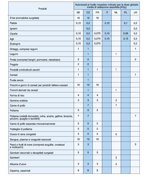 Le norme relative all’etichettatura prevedono inoltre che i prodotti alimentari se irradiati debbano riportare l’indicazione della denominazione e dell’indirizzo dell’impianto che ha effettuato il trattamento o il suo numero di riferimento. La direttiva comunitaria come già accennato, oltre a coprire gli aspetti generali e tecnici dell’attuazione del processo, ha previsto l’adozione di un elenco positivo di prodotti che, ad esclusione di tutti gli altri, possono essere trattati con radiazioni ionizzanti. L’elenco è stato pubblicato in Gazzetta Ufficiale dell’Unione Europea n. C 283 del 24/11/2009 a pagina 5 e prevede: