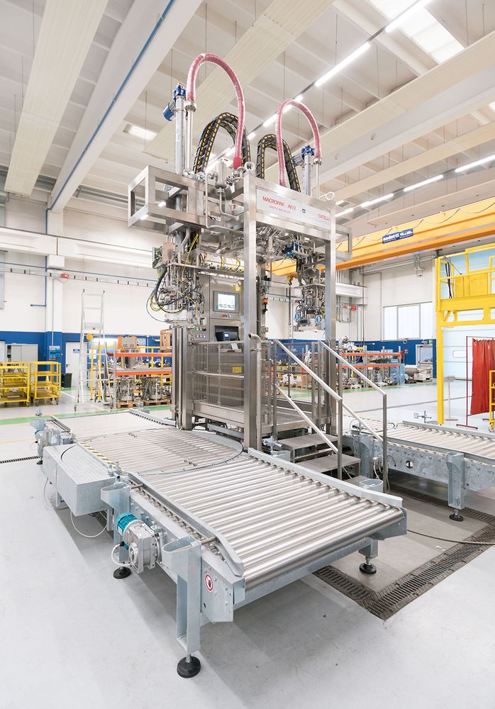 La riempitrice asettica a due teste permette di trattare prodotti alimentari semilavorati o finiti liquidi, semiliquidi, altamente viscosi o contenenti pezzi in sacchetti presterilizzati. Per i prodotti con pH >4,5 (bassa acidità) la sterilizzazione di beccucci, tappi e camera di riempimento per mezzo di vapore o calore non è sufficiente.