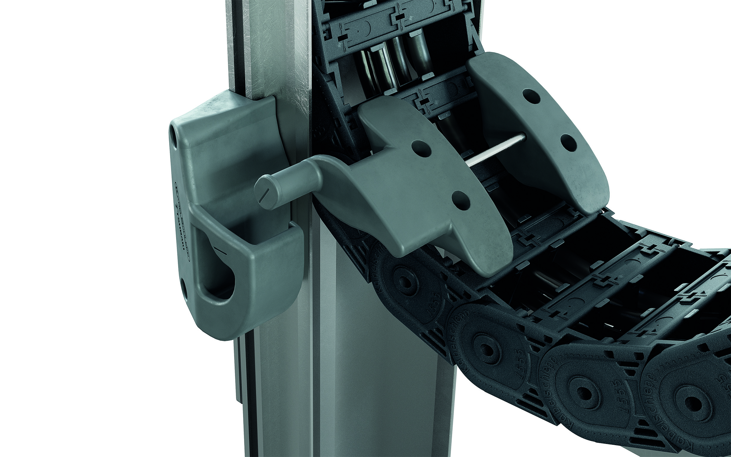 Il canale TKVG è progettato per la catena UNIFLEX Advanced 1555 di KABELSCHLEPP, disponibile con larghezza interna a partire da 75 mm e un raggio di curvatura di 125 mm. Ulteriori serie e tipi possono essere realizzati su specifica richiesta. L’utilizzatore beneficia di chiare opzioni nella progettazione: raccordi al punto fisso possono essere realizzati a destra o a sinistra, così come scegliere l’uscita dei cavi al punto mobile di trascinamento. Le distanze di montaggio dei supporti del canale sono adattabili in modo flessibile.