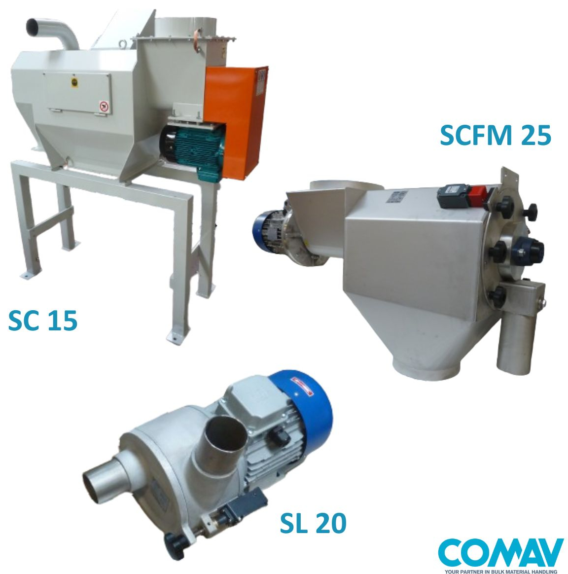 Sono disponibili due versioni, SL 20 e SL 100. La prima raggiunge capacità di 2000 kg/h, la seconda di 7000 kg/h. I setacci SC15 sono utilizzati per l’alimentazione gravimetrica verso altri componenti (una valvola stellare, per esempio) il cui compito principale è quello di omogeneizzare la granulometria del prodotto o rimuovere possibili elementi non ferrosi.